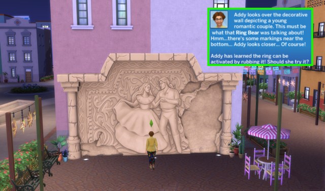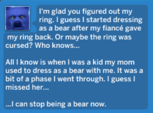 Upon examining it, Addy notices some odd markings on the inside of the band. She can’t read it but figures the sad-looking blue bear is sure to know something. I mean, that’s what you do, right? Go talk to the Sim wearing a bear COSTUME about rings found while fishing.