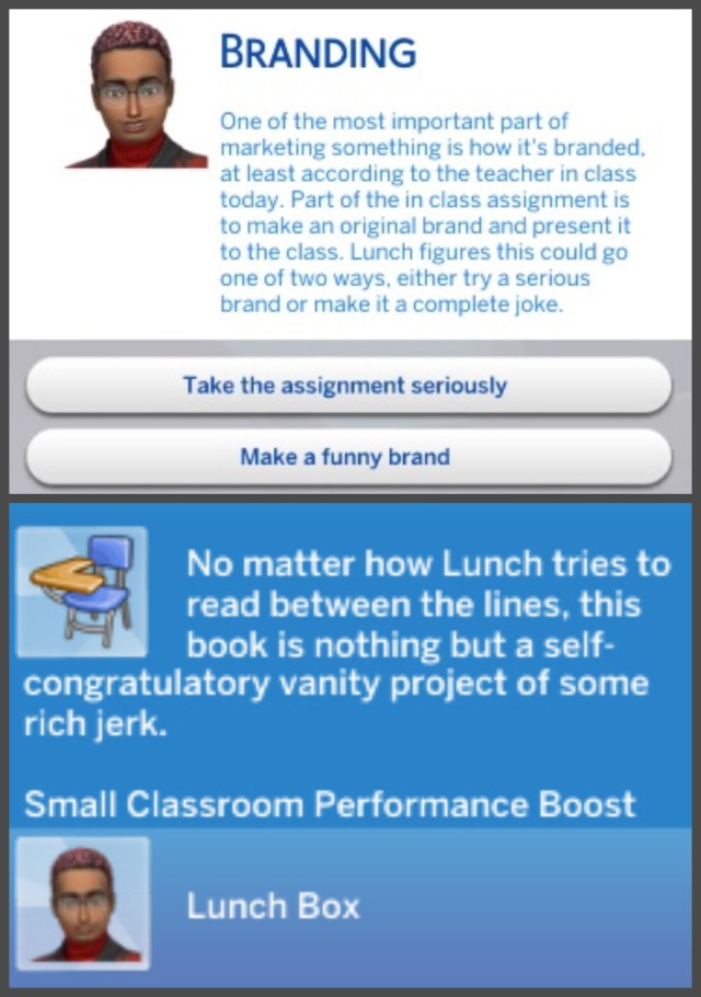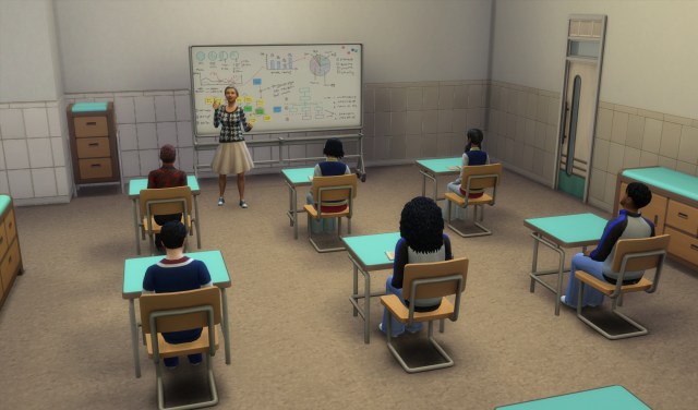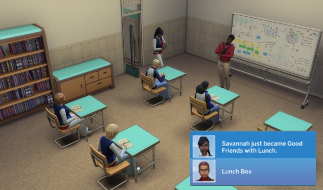 (A/N: Playing the high school pack is new to me, so please excuse me if I’m about to mention something you’re familiar with. I find this rather interesting – Class 1 has 6 students and Class 2 has 5. Even though the number in each class stays the same, the student attendance doesn’t. Some Sims switch classes and new arrivals means others don’t show up at all. For example, Greta Laurent was there on Lunch’s first day of school but hasn’t been back since. How do townie teens graduate?