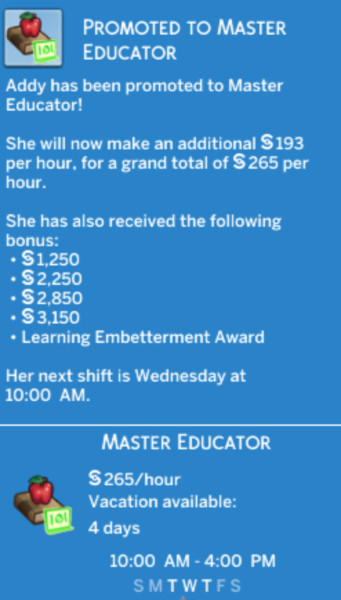 NOTE: When the mouse cursor hovers over the career icon, it indicates Professor (8). Addy recently completed the promotion tasks and will stay in this career long enough to see if anything changes once the check-mark is activated.