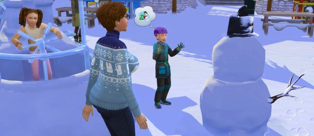 Addy decides to take a break before she breaks her back. Those things are heavy! She starts building a SnowPal and a boy joins in. It turns out well and the monocle gives it a distinguished air.