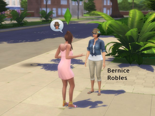 Her landlord takes a call and starts walking away mid-conversation so Farrah takes it as a sign that their visit is over. She sees a Sim with an interesting hat so decides to use the compliment, “Nice hat!”, as a way to meet her.
