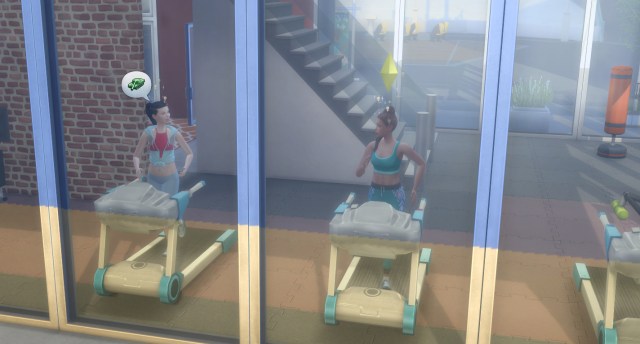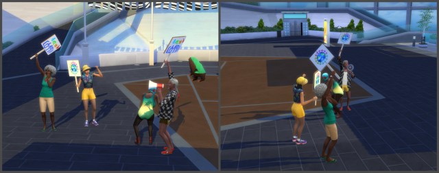Outside the Gym, several Sims are staging a protest but Farrah isn’t sure what their cause is.