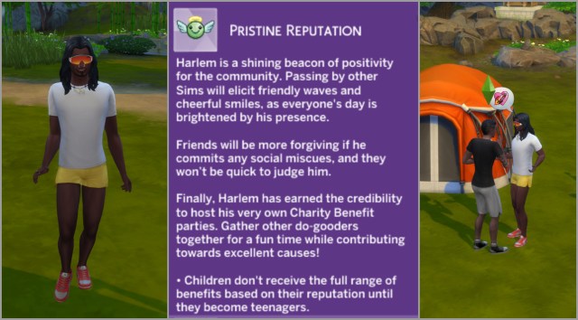 A flirty Haych stops by the very next morning & Harlem wonders if he should get a machine (coffee or tea) for all the Sims who drop by. This visit earns him the PRISTINE Reputation. Way to go, Harlem! Haych talks about WooHoo in a Rocket … Harlem (and I) wonder if he wants to do it or is bragging about how good it was when he gave it a go.