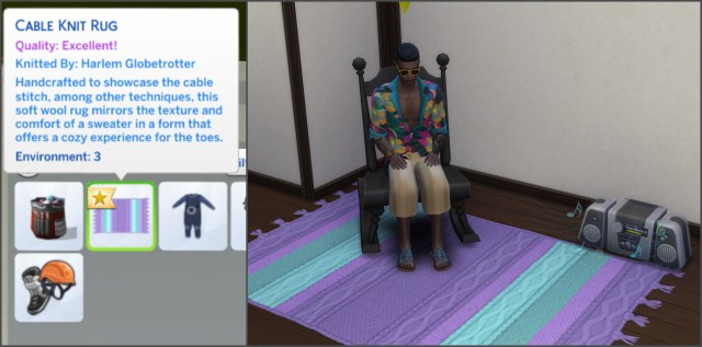 Harlem finishes the “mystery” knit project and decides to hold onto it for now. He might go for a different color combination once he starts placing furniture.