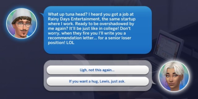 Ugh, not this again … Lewis, if we have to work together on a project then act like a decent Sim and get the job done. Otherwise, you go your way and I’ll go mine.