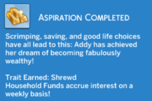 Ka-ching! Addy completes the Fabulously Wealthy aspiration and will now accrue interest on a weekly basis. Yay!