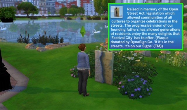 She also stumbles across a plaque discussing the Open Street Act and makes mention of ‘Festival City’. Is this San Myshuno?
